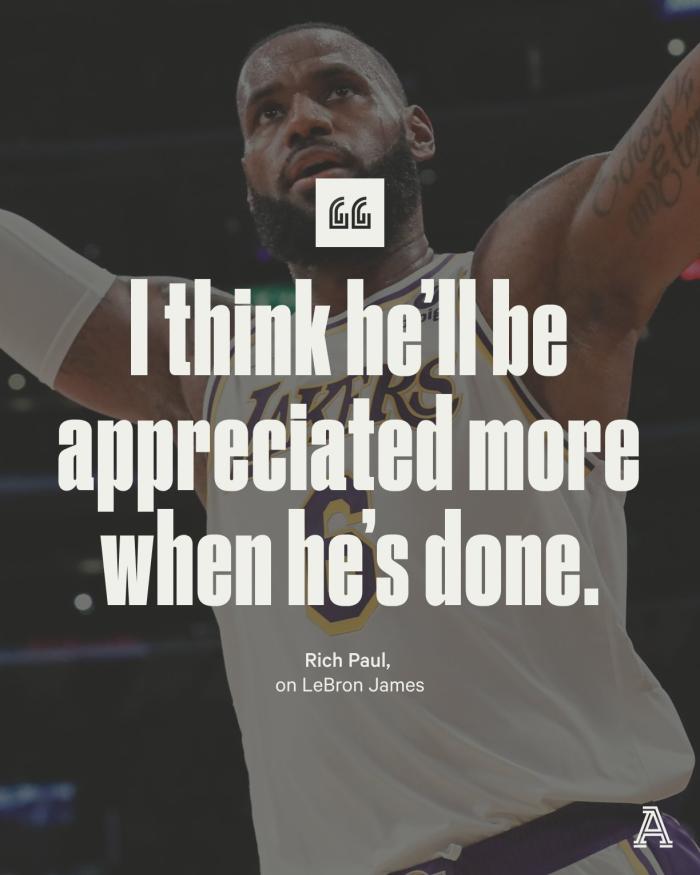 “有更多人带着微笑等着看勒布朗失败,而不是从一开始就给他支持。我认为当詹姆斯完成一切,结束生涯时,他会得到更多赞誉。
