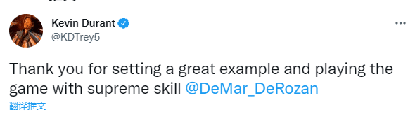 目前公牛5连胜,38胜21负排在东部第一,德罗赞打出超巨级别的表现,连续7场轰下35+太疯狂,本赛季单打效率联盟第一,德罗赞的出色表现获得杜兰特的盛赞,篮网巨星杜兰特发推狂吹德罗赞:感谢您树立了一个很好的榜样并以至高无上的技巧打比赛。