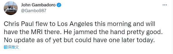 好球直播吧讯 ,据太阳记者John Gambadoro报道,当地时间今早,保罗从菲尼克斯飞往洛杉矶,在那里接受核磁共振检查,目前还没有保罗的伤情更新,但今天晚些时候太阳可能会更新保罗的伤情;本赛季已打满58场却遭遇伤病,而保罗有拇指伤病史。