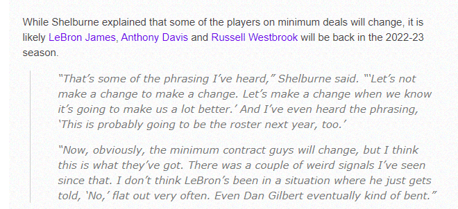 Ramona Shelburne还说:当然,很明显下赛季底薪球员的名单会改变,但我认为这就是他们(詹眉威)能得到的所有。我还看到了一些奇怪的信号,我认为詹姆斯在职业生涯中并不会经常被回复‘不’,甚至连丹-吉尔伯特(骑士)老板也不会那么说。