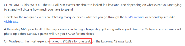 JRS直播02月16日讯 ,据克利夫兰当地媒体cleveland19.com报道,本赛季全明星正赛的最高票价已超过10000美元,其他各阶段赛事的最低票价也曝光了。