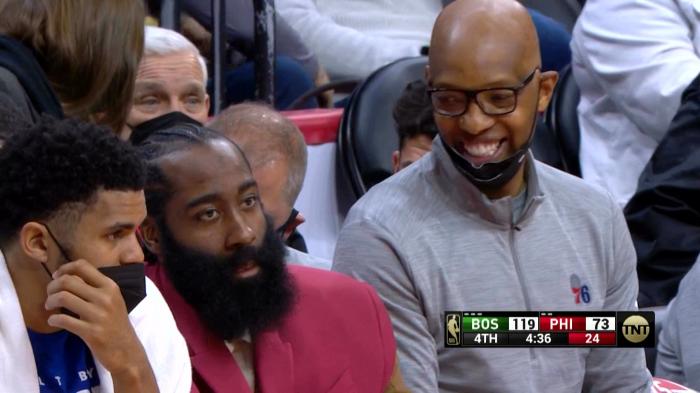 末节还剩4分36秒,镜头给到76人替补席,哈登表情沮丧难受,一副生无可恋的样子,此时坐在哈登身边的76人助教卡塞尔却乐开怀,哈哈大笑更突显哈登的难受,卡塞尔居然还能笑出来?
