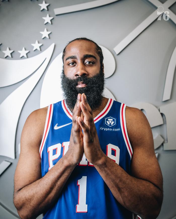 JRS直播02月15日讯 费城76人新援哈登正式亮相,身穿76人1号球衣拍摄定妆照,并且与恩比德等新队友第一次合练;期间哈登咧嘴大笑且早已笑得合不拢嘴,开心之情溢于言表,与此同时,哈登一举动正式告别篮网。