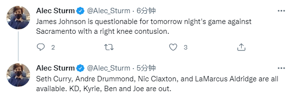 西蒙斯篮网生涯首秀还没确定,但赛斯-库里和德拉蒙德将在明天迎来篮网生涯首秀,小库里改穿篮网30号球衣,本赛季场均拿到15分4助攻3.4篮板,三分命中率40%;德拉蒙德改穿篮网4号球衣,本赛季场均替补拿到6.1分8.8篮板2助攻1.1抢断。