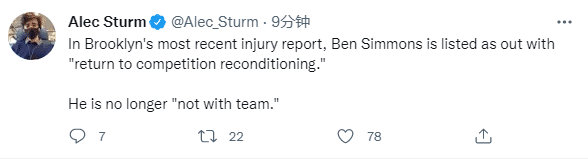 篮网新援西蒙斯被列为缺席比赛,缺席理由是重返赛场修复,不再是不在球队中;此前西蒙斯已经通过体检,预计本赛季会重返赛场,对于加盟篮网,西蒙斯十分兴奋且激动,改穿篮网10号球衣。