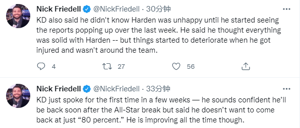 杜兰特本以为哈登一切都很好,但是当他受伤并且不在球队身边时,情况开始恶化;直到上周他开始看到这些报道突然出现时,他才知道哈登不开心。