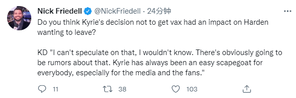 当被问及欧文不接种疫苗是否对哈登想要离开有影响时,杜兰特回答道:我不能推测,我也不知道。很明显会有有关这方面的谣言。欧文一直都是所有人的替罪羊,尤其是对媒体和球迷来说。