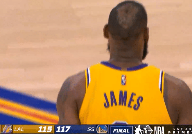 詹姆斯站上罚球线,第一次罚球打铁不中,浓眉过来和詹姆斯交流一下,之后詹姆斯缓口气,稳稳罚进第二球,詹姆斯第三罚故意罚不进,湖人抢到篮板,但詹姆斯出手三分时比赛已经结束,时间已经走完,最终湖人2分惜败。
