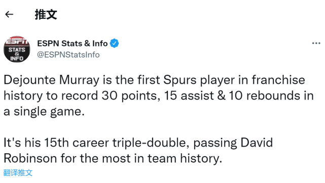 一场比赛,穆雷创造了马刺队史两个“第一”!他是马刺首位单场送出至少30分10板15助攻的球员,这也是他生涯第15次三双,超越海军上将大卫罗宾逊,独占队史第一。要知道,这仅仅只是穆雷马刺生涯第6个赛季,而大卫罗宾逊在马刺打了14年。