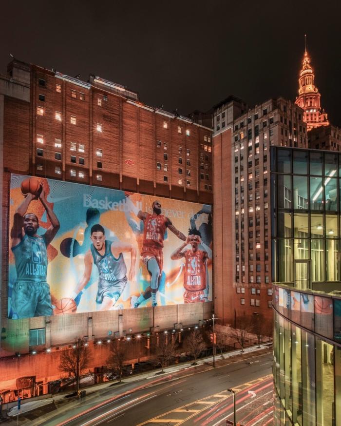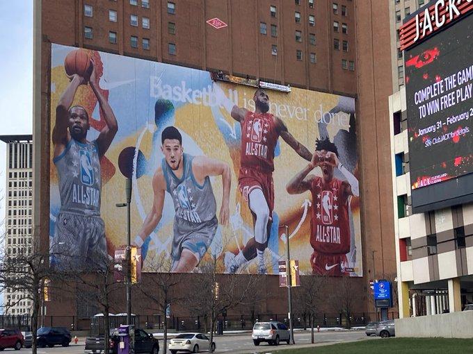 JRS直播02月12日讯 ,NBA 2022年全明星巨幅海报曝光,詹姆斯和杜兰特领衔,太阳球星布克和灰熊球星莫兰特也在其中,四大球星荣耀亮相,这一处巨幅海报正挂在克利夫兰骑士球馆的对面,几乎占据了一栋楼的整面墙。