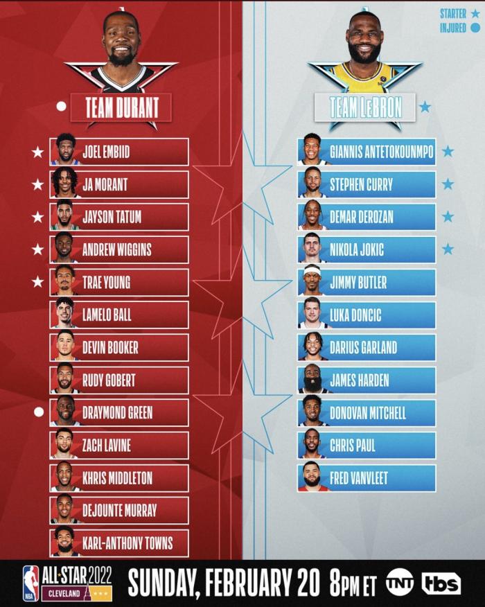 杜兰特第12次入选全明星,不过由于左膝副韧带拉伤,杜兰特再次无缘全明星正赛,塔图姆顶替杜兰特首发,三球递补入选全明星;西部则是穆雷顶替格林入选。