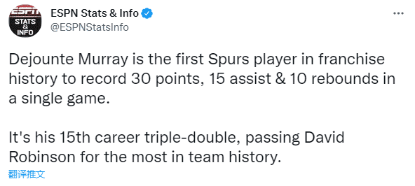 第一、穆雷成为马刺队史第一位单场轰下30+15+10三双的球员
