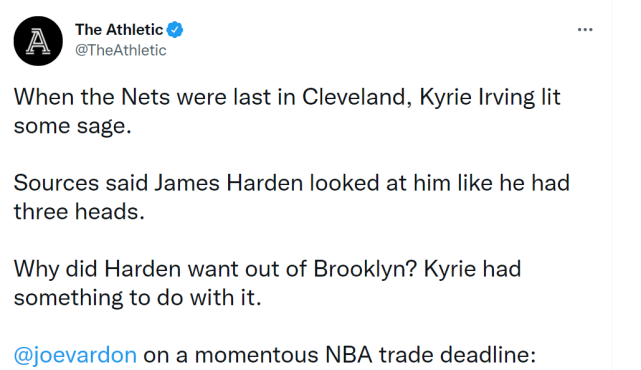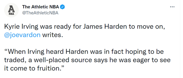 过去两个赛季,哈登已经换了两支球队,以他的性格,他肯定不会说自己离队和欧文有关,但Vardon表示,这确实和欧文有关。