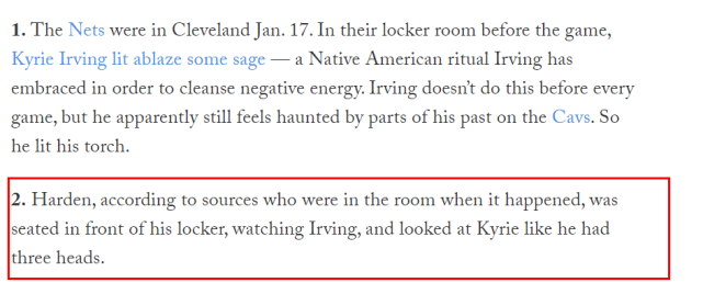 知情人透露,哈登当时就在更衣室里,坐在更衣柜前看着欧文的举动,就像欧文有三个脑袋那样。消息人士表示:“他俩之间有一种奇怪的氛围,可以看出来哈登很生气,但欧文并没有感受到哈登的情绪。”