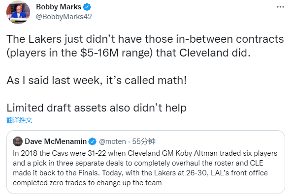 薪资专家Bobby Marks转推并写道:湖人不像当年的骑士那样拥有一些500-1600万的中档合同。正如我上周所说,这关乎于数学。有限的选秀权资源也没什么帮助。