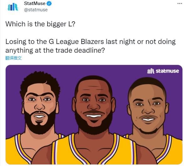 湖人零交易冲上推特热搜引热议,美媒NBA central晒詹姆斯捂眼表情,言外之意就是湖人的操作让人没眼看;美媒MuseStat发推写道:哪一个是更大的输?昨天输给发展联盟阵容的开拓者还是交易截止日啥也没做。