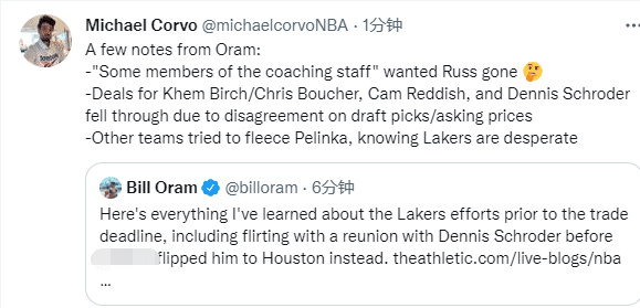 湖人教练组一些成员想让威少离开,但湖人从未在威少交易中获得吸引力,因此佩林卡只能在交易市场的边缘进行操作,有几笔潜在交易都未达成,比如湖人有意雷迪什、有意交易得到施罗德以及与猛龙尼克斯探索三方交易,都以失败而告终,一大原因是对手要价不切实际。