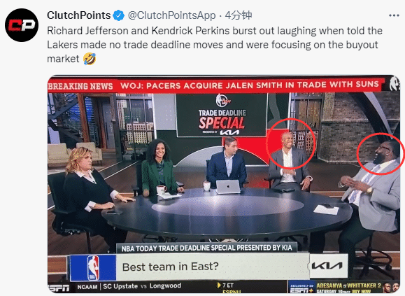 对此两大前NBA球员现任评论员的理查德-杰弗森和帕金斯在节目中哈哈大笑,嘲笑湖人高管的无能。