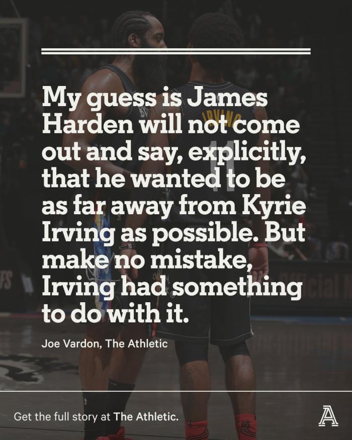 篮网交易哈登之后,骑士跟队记者Joe Vardon报道,欧文渴望哈登离队,该记者爆料:欧文准备好了和哈登一起继续前进;不过当欧文听说哈登实际上希望被交易时,一位内部人士说,他渴望看到它实现。