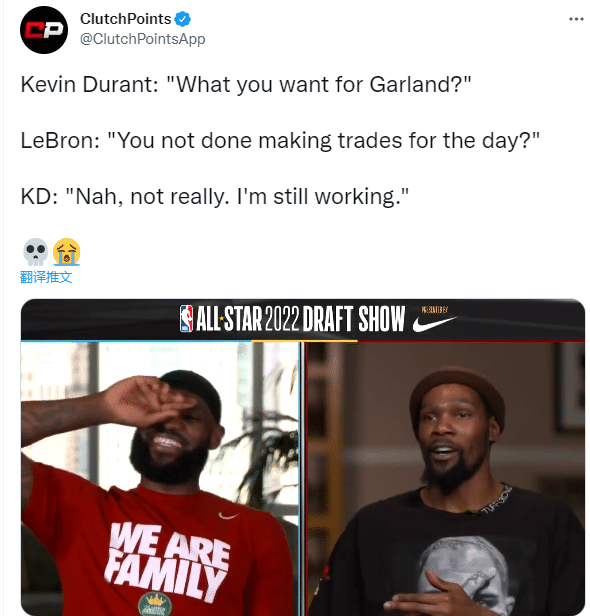 选人结束后,詹姆斯试探地问到:“KD,我们今天要不要做个交易(暗示想不想把自己的好兄弟(哈登)换过去)?”