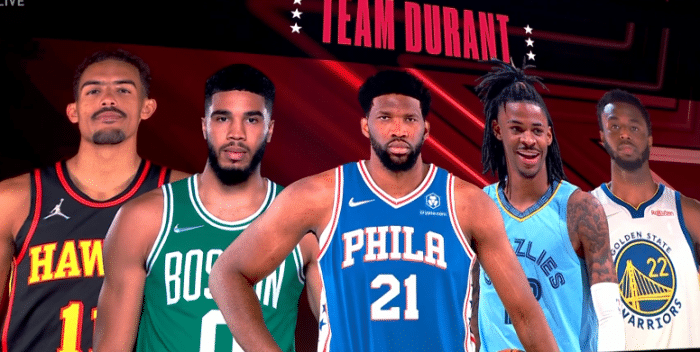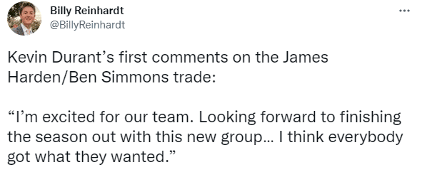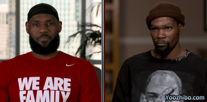 詹姆斯身穿红色T恤出镜,杜兰特身穿黑色T恤并且戴着一顶针织帽;期间杜兰特回应哈登和西蒙斯互换东家,大交易后首次回应:我为我们的团队感到兴奋。期待与这个新团队一起结束这个赛季,我认为每个人都得到了他们想要的。