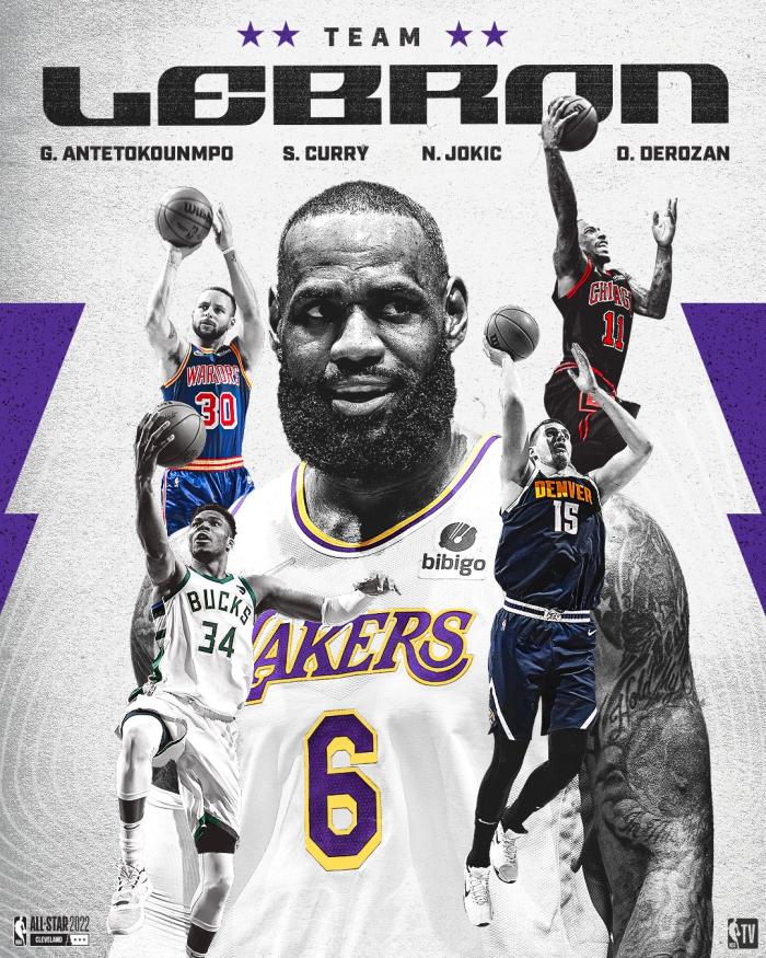 首发阵容:首选字母哥、库里、德罗赞、约基奇和詹姆斯(队长),詹姆斯队首发有4个MVP。