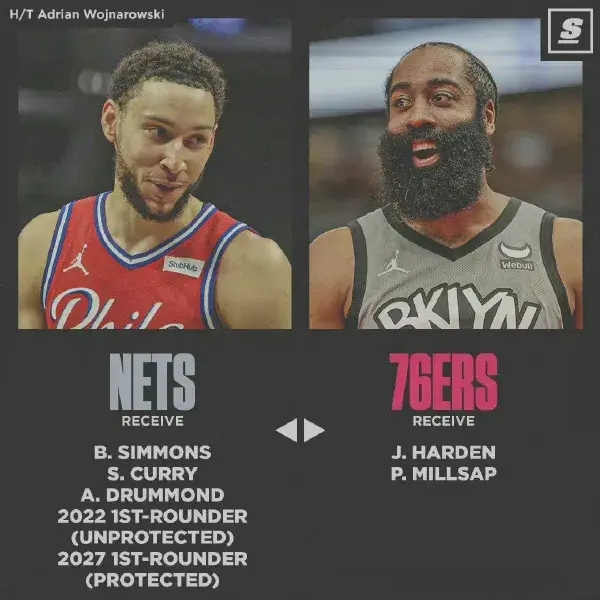 76人队送出的筹码是西蒙斯、赛斯-库里、安德烈-德拉蒙德、2022年不受保护首轮签,以及2027年受保护首轮签,从布鲁克林得到哈登和保罗-米尔萨普。