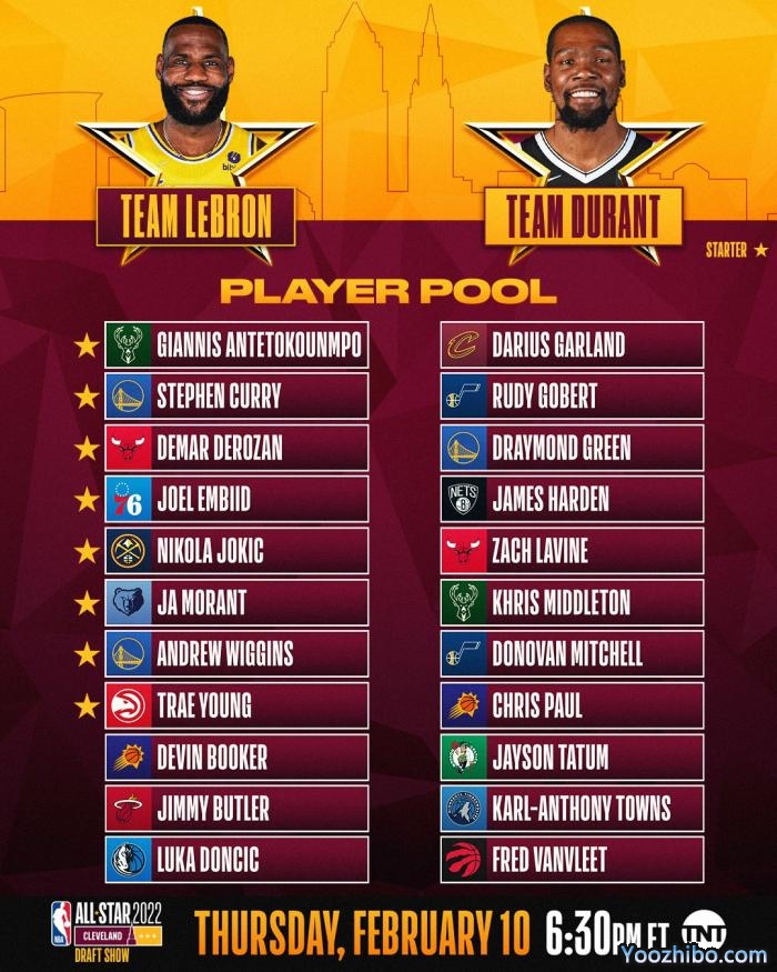 詹姆斯和杜兰特将在2月11日直播选人组队。