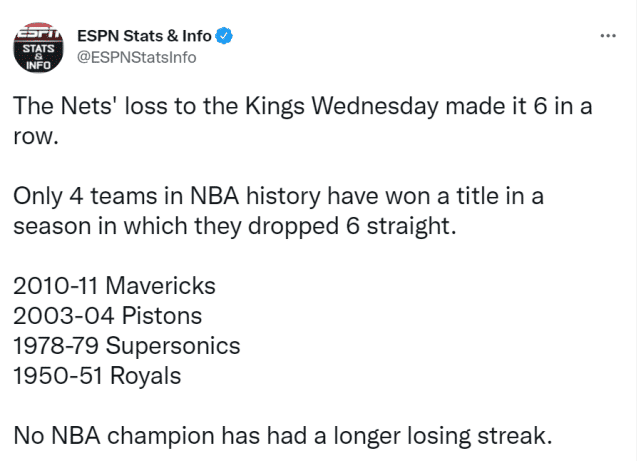JRS直播02月04日讯 ,一波6连败,让篮网的排名跌至东部第6位。他们还能夺冠吗?ESPN数据显示,夺冠赛季曾遭遇6连败的球队,NBA历史上只有4支,他们分别是2010-11赛季的独行侠,2003-04赛季的活塞,1978-79赛季的超音速队(雷霆前身),1950-51赛季的皇家队(国王前身)。值得一提的是没有任何冠军球队在夺冠赛季遭遇过更长的连败。