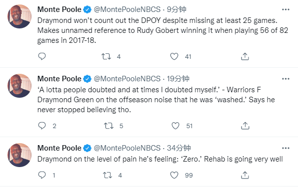 谈及背部伤势,追梦格林表示:一点都不痛(zero),(背伤)恢复得很顺利;格林还表示他将在3-4周内复出,但是没有确切的回归时间表。