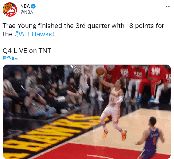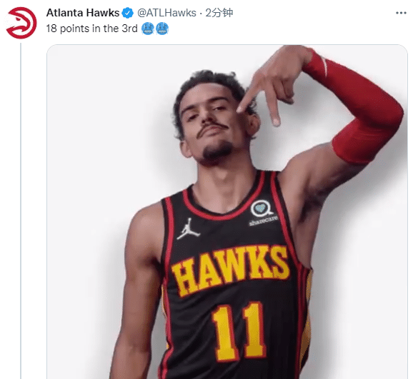 下半场,老鹰第三节的进攻更加猛烈,单节36-30继续扩大领先,特雷-杨彻底杀疯了,外线三分不讲理,抢断反击一条龙上篮,单节投进3记三分,第三节9投6中独砍18分,三节打完老鹰领先9分;老鹰官方和NBA官方都夸赞吹杨单节18分的表现。
