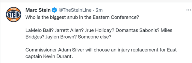 不过,斯坦恩也提到了杜兰特将因伤缺席全明星赛,另外格林自己也宣布会因伤缺席,这给了联盟两个替补的机会。谁会获得这两个顶替入选的名额,答案很可能就在这份11人名单中。大家觉得还有谁是全明星遗珠呢?