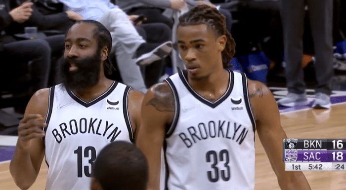 第二节,哈登喂饼克拉克斯顿扣篮,但两次出手继续打铁,当哈登休息时,欧文带队领先到两位数;第二节1分49秒,哈登终于打进运动战进球,助攻约翰逊投进三分,之后出现传球失误,篮网半场62-54领先8分。