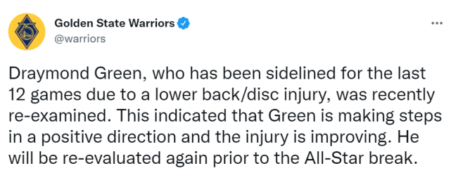 勇士官方表示,格林复查显示恢复良好,将在全明星周末前再次评估。