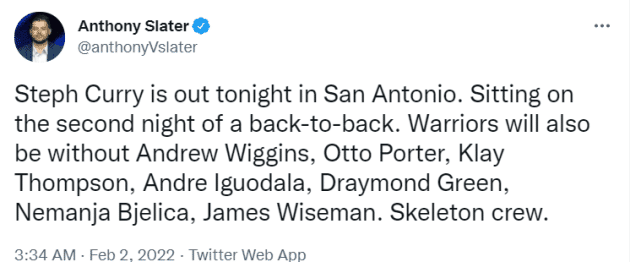 JRS直播02月02日讯 ,据勇士记者安东尼-斯雷特报道,考虑到是背靠背第二场,库里将缺席今天客场对马刺的比赛。同时缺席这场比赛的还有汤普森、伊戈达拉、格林、维金斯、波特、别利察和怀斯曼。勇士一口气把8名球员放在休战名单上,难怪有球迷调侃主教练:科尔尝试终结勇士的连胜。