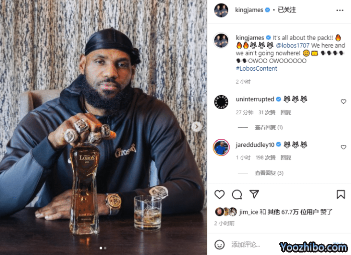 JRS直播02月02日讯 ,湖人当家球星勒布朗-詹姆斯更新社交媒体,在Ins上晒出自己戴着四枚总冠军戒指推广新酒的照片,4枚冠军戒指十分显眼;并且配文写道:这是有关族群的,我们就在这儿,哪儿也不会去(狼嚎OWOO OWOOOOOO)。