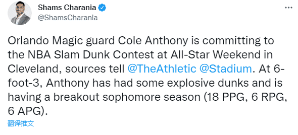 据名记shams报道,魔术21岁新星科尔-安东尼承诺参加今年全明星赛的扣篮大赛,他与三球是同届新秀,2020年首轮15号秀,本赛季已经为魔术出战36场比赛,场均得到17.9分6篮板6助攻,有望参加全明星新秀挑战赛。