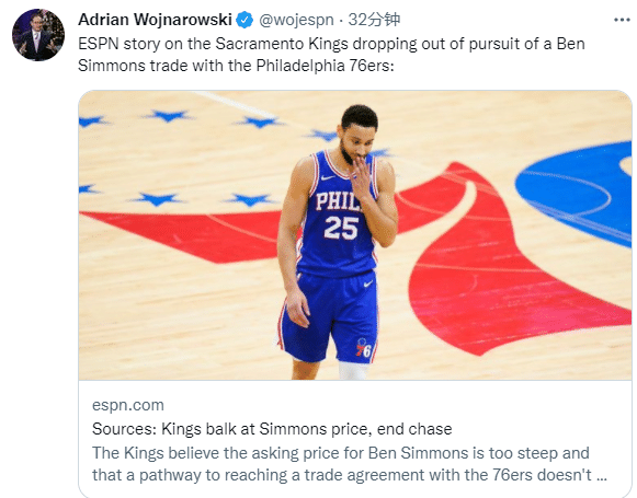 此前,国王是市场上积极追求且一度最合适达成西蒙斯交易的多支球队之一;现在国王认为76人对于西蒙斯的交易要价过高,所以国王认为双方不可能就交易方案达成一致,因此放弃追求西蒙斯;接下来,国王将会专注于与其他球队的交易谈判。