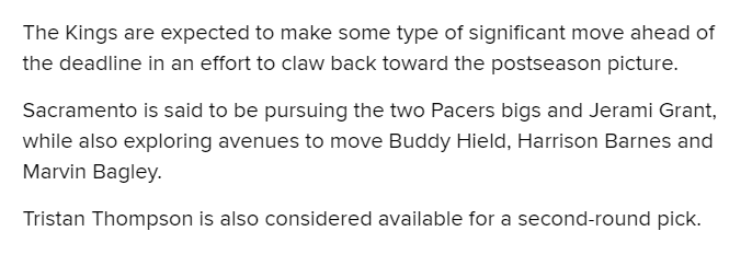 国王正在追求步行者双塔——多曼塔斯-萨博尼斯和迈尔斯-特纳以及活塞前锋杰拉米-格兰特,同时国王已经把希尔德、哈里森-巴恩斯、巴格利和特里斯坦-汤普森摆上货架,国王对TT的要价是一个次轮选秀权。