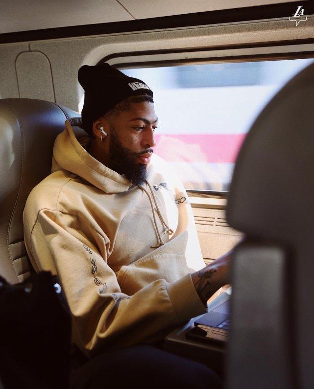 湖人官方还晒出了湖人前往费城参赛的照片,从布鲁克林到费城只有150多公里,这一回他们的交通工具不是飞机,而是火车。詹姆斯一手拿着手机,一手握着瓶水,冲着镜头做鬼脸。浓眉则玩着笔记本,威少一脸平静。