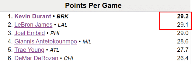 赛季至今,詹姆斯场均出场36.6分钟,创湖人生涯新高,场均贡献29.1分8.8篮板6.3助攻,场均得分排名第二,距离榜首的杜兰特(29.2分)只差0.1分。