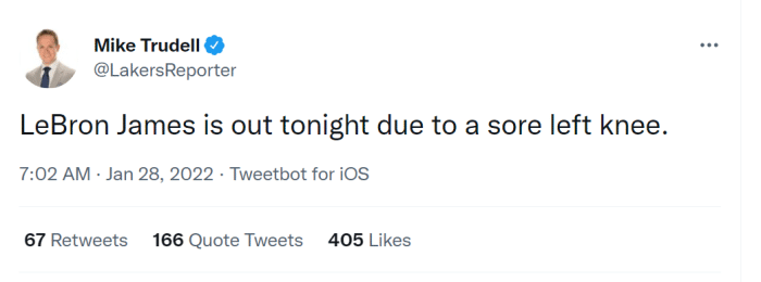 JRS直播01月28日讯 ,湖人官方更新今日对阵76人的伤病名单,詹姆斯的名字重新出现在其中。名单上显示詹姆斯左膝酸痛,今日状态是questionable(出战成疑,上场可能性50%),赛前热身后,詹姆斯的状态改为out(休战)。湖人记者Michael Corvo表示,詹姆斯的膝盖状况来得很突然,因为24小时前,湖人的伤病名单上还没有他,而且此前詹姆斯也没说过自己的膝盖有任何不适。