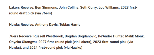 76人得到威少、博格达诺维奇、亨特、蒙克、奥孔古、2027年首轮(来自湖人)和两个来自老鹰的首轮