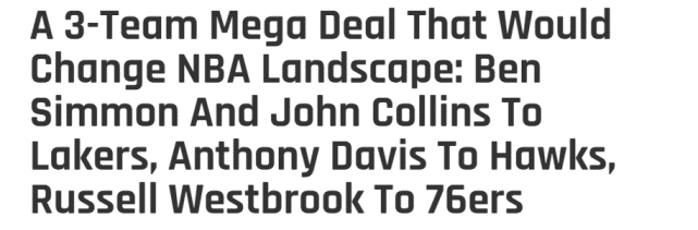 JRS直播01月27日讯 随着交易截止日的临近,越来越多的交易方案被美媒列出并讨论。北京时间1月27日,美媒Fadeaway World列出了一笔涉及3队超过10人的大交易方案,在这笔方案中,湖人把威少和浓眉都送走,获得4位新援来联手詹姆斯。