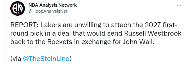JRS直播01月27日讯 ,湖人拒绝2换1交易威少,据名记Marc Stein报道,湖人不愿意把2027年首轮选秀权加入威少换沃尔的交易之中,换句话说,湖人拒绝用威少+2027年首轮签换沃尔,拒绝与火箭达成2换1的交易。
