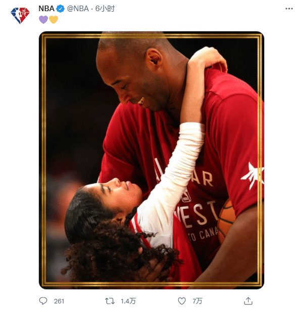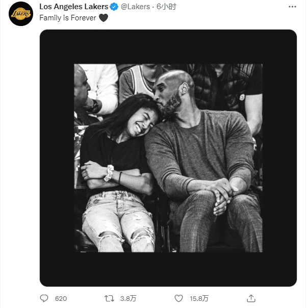 湖人官方缅怀科比,晒科比亲吻女儿黑白照:一辈子的家人。