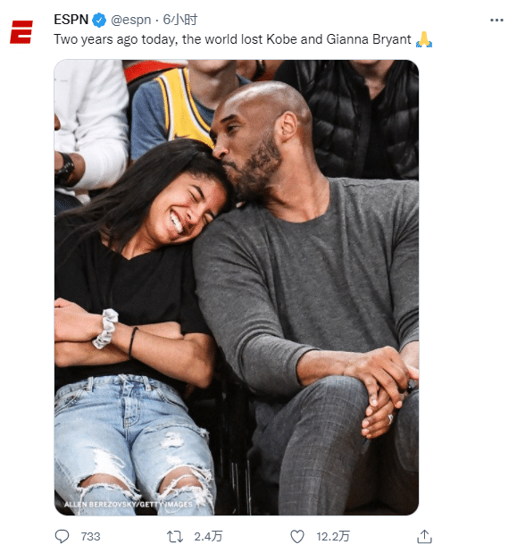 美媒ESPN晒照写道:两年前的今天,全世界失去了科比和GIGI;美媒House of Highlights写道:我们想你了,科比!