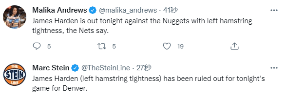 杜兰特(左膝副韧带扭伤)、哈登(左腿筋紧张)、欧文(没资格参加主场)、乔-哈里斯(脚踝伤势)、夏普(非新冠生病)、克拉克斯顿(伤病管理)、米尔萨普(个人原因,他已和篮网达成分手协议)和小杜克(仍在发展联盟)。