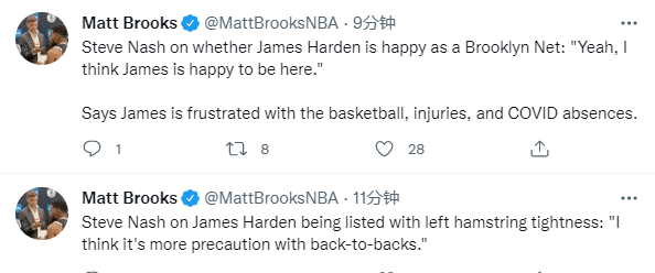 赛前,哈登因左腿筋紧张被列为出战成疑,对此纳什表示:我认为我们需要在背靠背比赛中更加谨慎;谈到哈登在布鲁克林是否开心,纳什回应:是的,我认为他来到这里后很开心,他现在只是对篮球、伤病和球员因新冠缺席等事情感到有些沮丧。