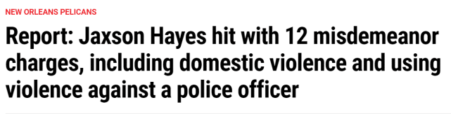 JRS直播01月25日讯 ,据TMZ体育报道,鹈鹕中锋杰克森-海耶斯面临12项罪名指控,而所有指控都源于2021年7月发生的一起事件。